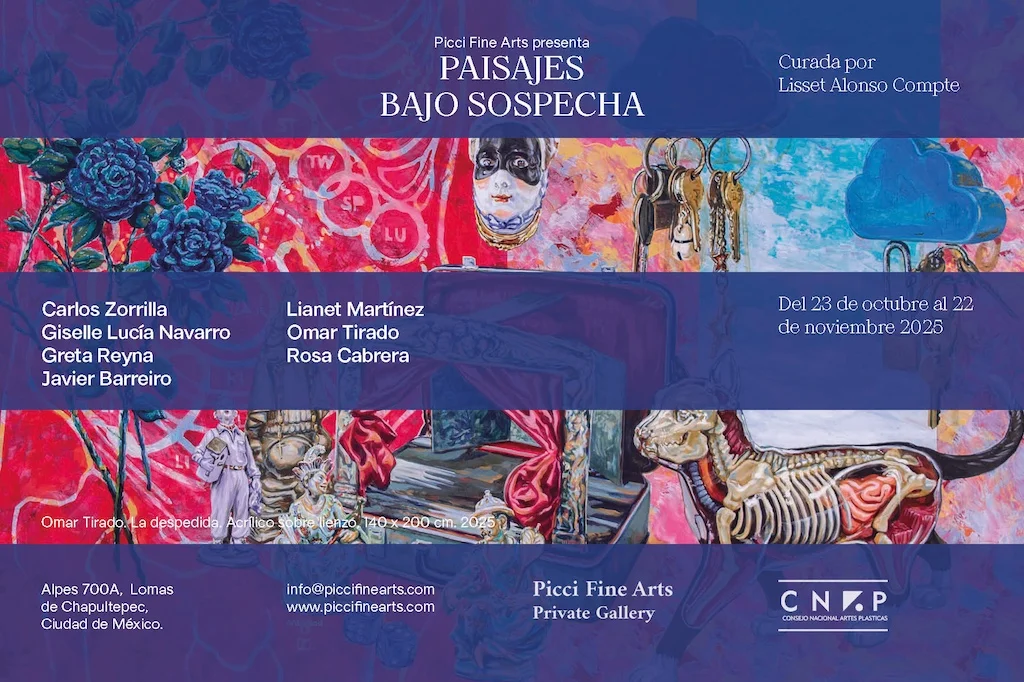 🔹 Por primera vez en México la galería Picci Fine Arts reúne el trabajo de Javier Barreiro, Rosa Cabrera, Lianet Martínez, Giselle Lucía Navarro, Greta Reyna, Omar Tirado y Carlos Zorrilla en una muestra en la que estos artistas dialogan explorando cómo el paisaje se entrelaza en un mapa afectivo-político y se convierte en un escenario de incertidumbre y transformación.